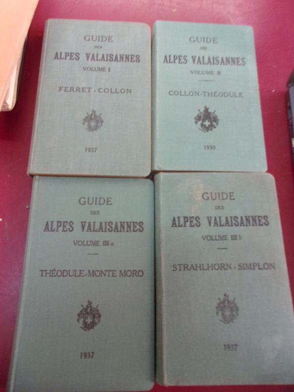 4 Volumes. Club Alpin Suisse, 1930/1937. Format : 17/11. Tome I : Du Col Ferret au Col Collon : 496 pages - Avec 73 illustrations (croquis) - 1024. 1937. Tome II : Du Col Collon au Col de Théodule : 347 pages + 32 (Notice toponymique) - Avec 62 illustrations (croquis)- 726 notices- 1930. Tome III a : Du Col Collon au Monte Moro : 264 pages - Avec 62 illustrations (croquis). 335 notices - 1937. Tome III b : Du Strahlhorn au Simplon: 680 pages - Avec 70 illustrations (croquis) 992 notices - 1937. Bon état