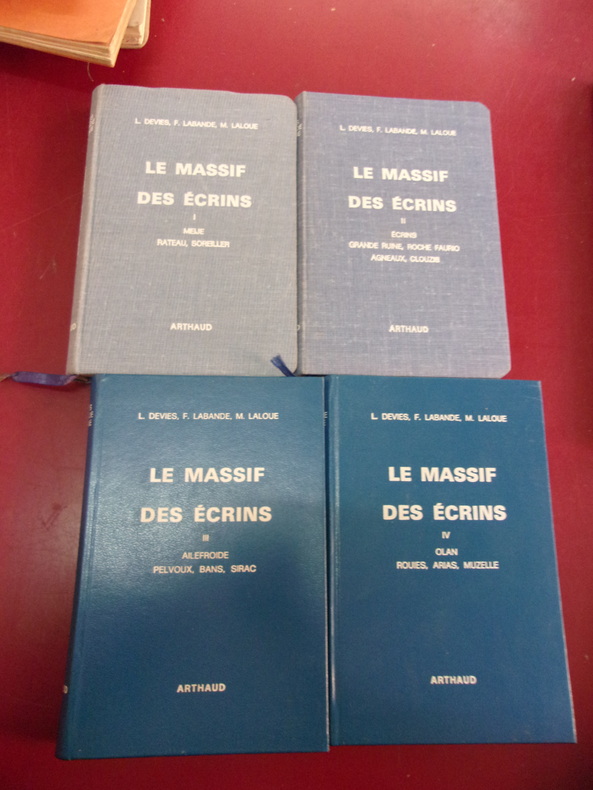 4 tomes Arthaud, 1976/1978. Format : 17/11. Tome I : Meije - Rateau - Soreiller - 299 pages - 39 dessins - 442 notices - 1976 - Reliure toilée. Tome II: Ecrins- Grande Ruine - Roche Faurio - Agneaux - Clouzis - 304 pages - 40 dessins - 444 notices - 1976 - Reliure toilée. Tome III : Ailefroide - Pelvoux - Bans - Sirac - 310 pages - 41 dessins - 427 notices - 1978 - Reliure skyvertex. Tome IV : Olan - Rouies - Arias - Muzelle - 299 pages - 44 dessins - 519 notices - 1976 - Reliure skyvertex. Bon état