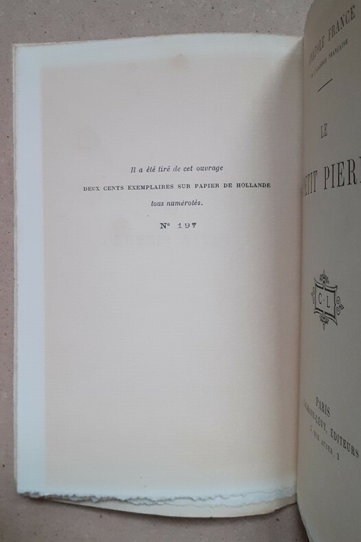 Anatole France est déjà âgé de 74 ans quand il livre avec précisions et un ton de confidence dans Le Petit Pierre (1918) ce qu'il a déjà auparavant évoqué dans Le Livre de mon ami (1885), puis dans Pierre Nozière (1899). Au contraire des deux premiers Le Petit Pierre se présente beaucoup plus riche en notations qui révèlent le caractère de l'auteur. « France nous y apprend que son esprit s'est modelé sur celui de son père, traditionaliste, spiritualiste et même chrétien, mais 'comme une coupe moulée sur le sein d'une amante' ! C'est-à-dire qu'il en reproduisit en creux les plus suaves rondeurs. Façon bizarrement poétique poétique d'exprimer qu'il prit en toutes choses contre-pied des opinions [...] de son éducateur ! ». Jolie provenance pour cet ensemble de souvenirs conservé dans une chemise-étui au nom de Paul Souday. Critique littéraire, ami de l'auteur, Souday est entre autre célèbre suite à la polémique qui l'opposa à Marcel Proust auquel il reprocha dans une tribune du Temps (10 décembre 1913) les «fautes de français» dans Du côté de chez Swann... L'histoire dit que l'auteur de la Recherche lui pardonna, qu'ils devinrent même amis et que ce qui les avaient fâchés devint un sujet de plaisanterie. Des bibliothèques Paul Souday puis Lucien Graux (ex-libris).