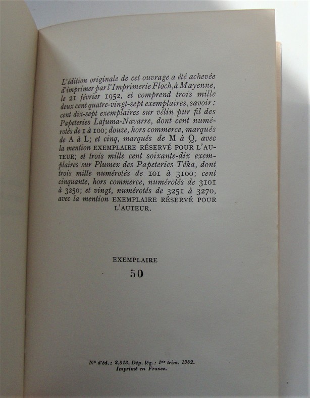 Editions Gallimard Editions Gallimard, 1952. In-12 broché, non coupé de 227 pages. Edition originale numérotée. 1/3000 exemplaires sur plumex (après 117 ex. de tête sur vélin). Très bon état