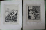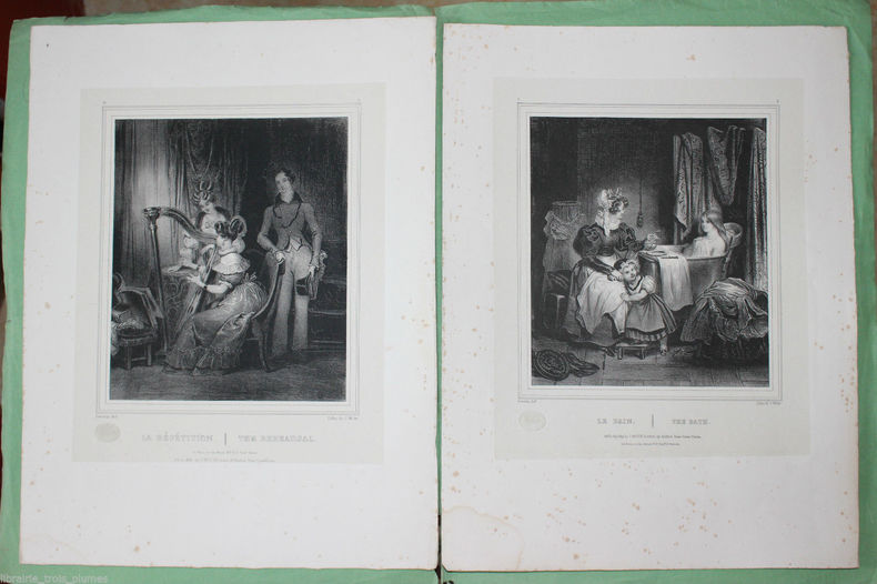 Rare série intitulée : Album de douze sujets composés et lithographiés par A Devéria 1830 Publié à Paris chez Ch. Motte (et à Londres). Exemplaire sur Chine, indiqué à l'encre rouge sur la couverture. Les gravures sont dans la chemise verte d'origine (petites déchirures à la chemise) avec un envoi de Devéria au crayon : ""Madame la C[om]tesse de la ??. A.D"" 11 des 12 gravures sont tirées sur Chine, contrecollées sur vélin, la 2e est un tirage classique, certaines sont numérotées en haut à droite, certaines ont un timbre à froid de Ch. Motte. Dimensions : gravure 175*145mm environ, papier chine 230*185mm environ, feuille 360*270cm environ (sauf la gravure sur papier courant dont la feuille est plus petite) Le repos Soirée de Carnaval/Mascarade La Maman La toilette L'aumone L'harmonie Convalescence La petit compagnie / Little party Méditation Le receuillement / The recollection (sur papier courant) La répétition / the rehearsal Le bain / the bath Rousseurs, mouillure en marge d'une gravure, la gravure sur papier courant un peu vieillie. Rare