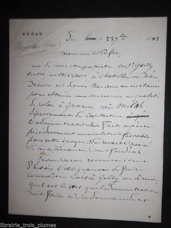 L.A.S., Die, 23 septembre 1881, 2p In-4 (25 lignes environ). En-tête du Sénat. Il écrit au préfet d'Alger, Joseph Firbach, pour lui recommander un de ses compatriotes de Chatillon-en-Dion, cultivateur, pour lui obtenir une concession dans la commune de Grarin (?), près de Milah (Mila aujourd'hui). Il mentionne aussi un autre compatriote qui aimerait savoir ce qu'il en est pour sa demande.