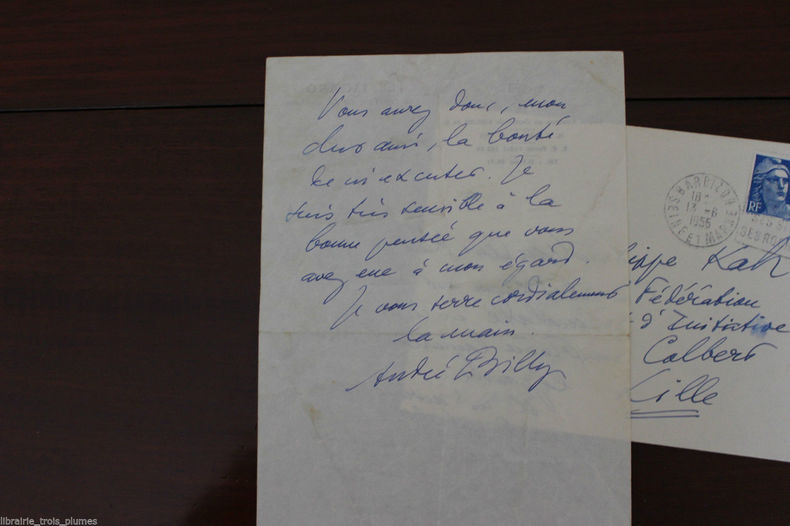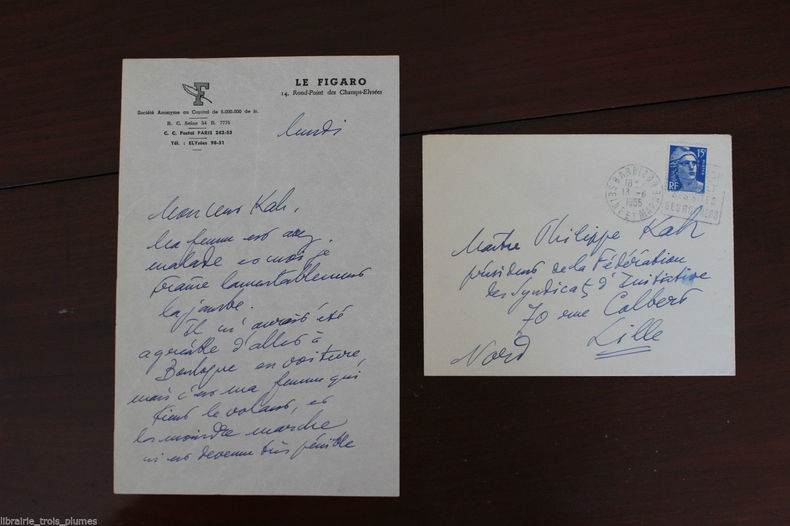 L.A.S.+enveloppe, 13 juin 1955, 1pœ In-8 (20 lignes). En-tête du Figaro. Il écrit à l'avocat lillois Philippe Kah car il ne peut venir à Boulogne, ni en voiture car c'est sa femme, malade, qui conduit normalement, ni à pied car il « traine lamentablement la jambe ».