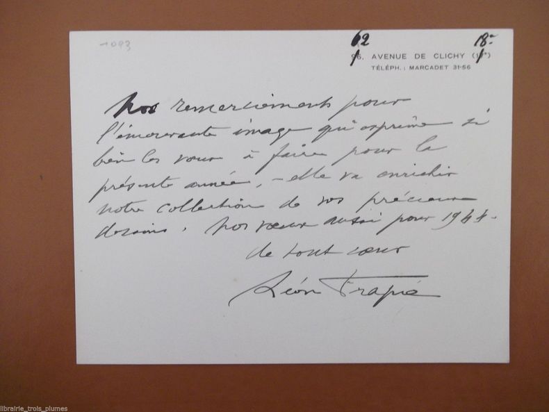P.A.S., sd [1944], 1p In-12 (7 lignes). Il écrit au peintre Germain Delatousche pour le remercie pour « l'émouvante image qui exprime si bien les voux à faire pour la présente année » et qui va enrichir leur collection. Il présente aussi ses voux.