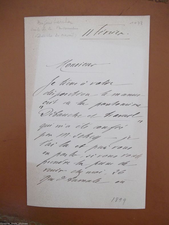 [ 3 L.A.S. adressées à Mlle Simone Arnaud Delage ] Lettre autographe signée de Camille Doucet, de l'Académie Française, 1 page à en-tête de l'Institut de France sous enveloppe marquée "Académie Française", datée du 25 mai 1885 : "Mademoiselle et chère confrère, Rien de plus touchant et de plus dramatique que votre Roche "Mengan", j'en suis encore tout ému & je m'empresse de joindre mes très sincères compliments aux remerciements que je vous dois pour votre bon et gracieux souvenir" ; Lettre autographe signée de Georges Monval, Bibliothécaire Archiviste de la Comédie Française, datée du 12 février 1883, 1 page sous enveloppe : "Mademoiselle, J'ai l'honneur de vous informer que, dans sa séance du 8 février, le Comité d'Administration du Théâtre Français a pris connaissance du rapport fait par la Commission d'examen sur votre comédie : "Mademoiselle du Vigean". J'ai en même temps le plaisir de vous annoncer que le Comité, s'associant aux conclusions de ce rapport, a réservé votre ouvrage pour l'envoyer devant le Comité de Lecture" ; Lettre autographe signée d'Albert Delpit, 4 pages sous enveloppe : "Mademoiselle, j'irai vous voir demain. [ ... ] Il est fort possible que je ne sois pas libre à 4 h ; mais plus tard. Et j'ai besoin de vous voir car j'ai des conseils importants à vous donner sur Jane Grey. Voulez-vous que nous admettions ceci ? Si vous ne receviez rien de moi, demain avant midi, c'est que j'irai rue St Pétersbourg [ ... ]