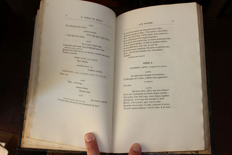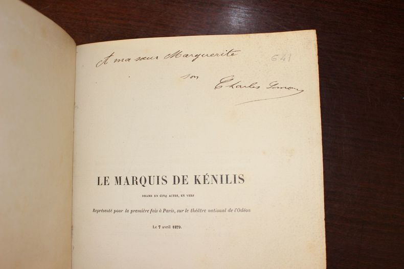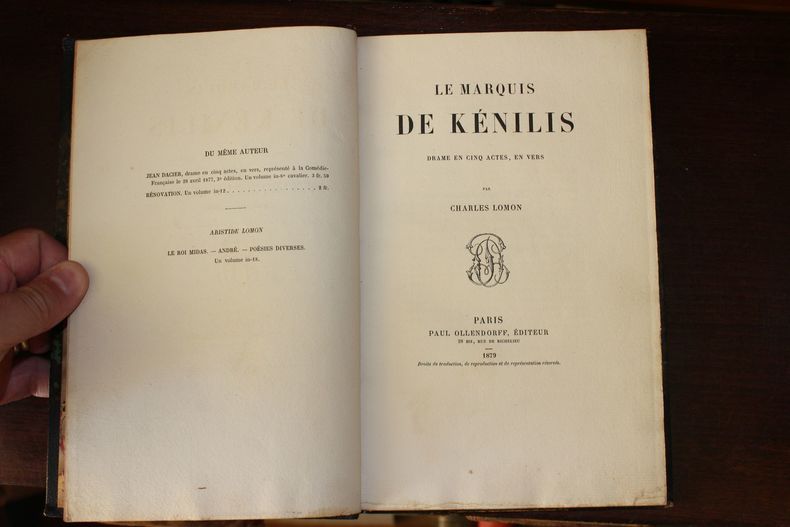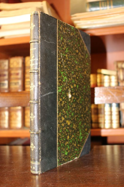 Paris, Paul Ollendorff, 1879. In-8, [8]-152p. Edition originale, un des 75 sur hollande (non numéroté ici) enrichi d'un envoi de l'auteur à sa sour. Cette pièce de théâtre, dédiée à Juliette Adam, fut jouée à l'Odéon, deux ans après sa première pièce Jean Dacier, jouée à la Comédie-Française. Coquelin en effet, qui avait joué Jean Dacier, refusa cette pièce et Juliette Adam fit alors tout son possible pour qu'elle soit jouée à l'Odéon. Lomon était hydropathe d'honneur, preuve de son succès à l'époque. Reliure demi-chagrin à coins, mors supérieur fendillé, frottis sur le dos. Rare ouvrage