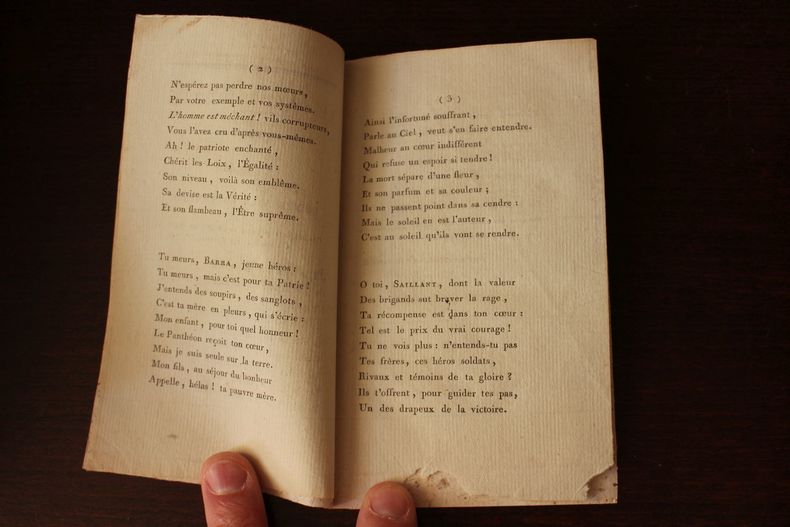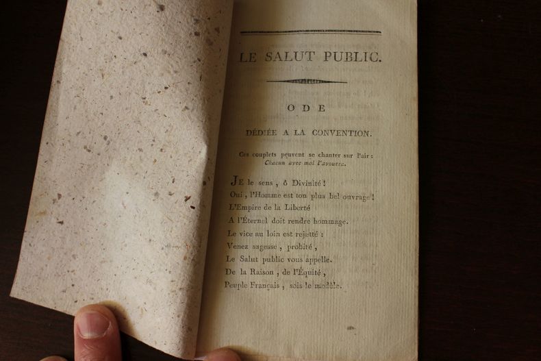 S.l. [Paris], s.n., s.d. [1793/1795]. In-16 (15.2*9cm), 4p. Plaquette rare, probablement le premier (et unique) tirage à part. Ce texte apparait en l'an III dans le Chansonnier des amateurs, dédié aux amis de la république (Paris, Caillot). En dehors de cette autre parution, qui ne nous apprend rien sur l'auteur éventuel, nous n'avons pas trouvé trace de ce petit texte. La section Mutius-Scaevola est la section du Luxembourg. Elle a pris ce nom entre brumaire an II (octobre 1793) et prairial an III (mai 1795). Ces couplets peuvent se chanter sur l'air : Chacun avec moi l'avouera. Sous couverture marbrée moderne, petits manques de papier en marge. Rare.