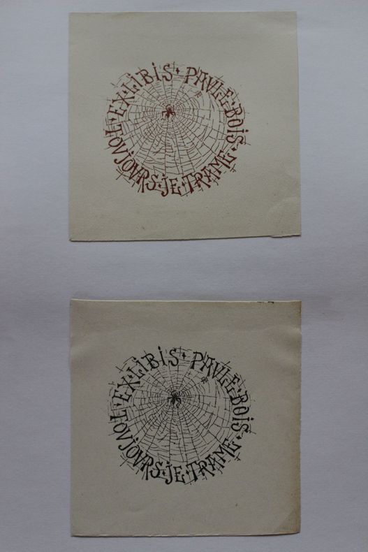 Ex-libris collé(s) sur une feuille cartonnée 21*27cm. Lot de 2 Ex-libris identiques mais tirés en 2 tons différents (92*92mm) avec une araignée et la devise « toujours je trame ».