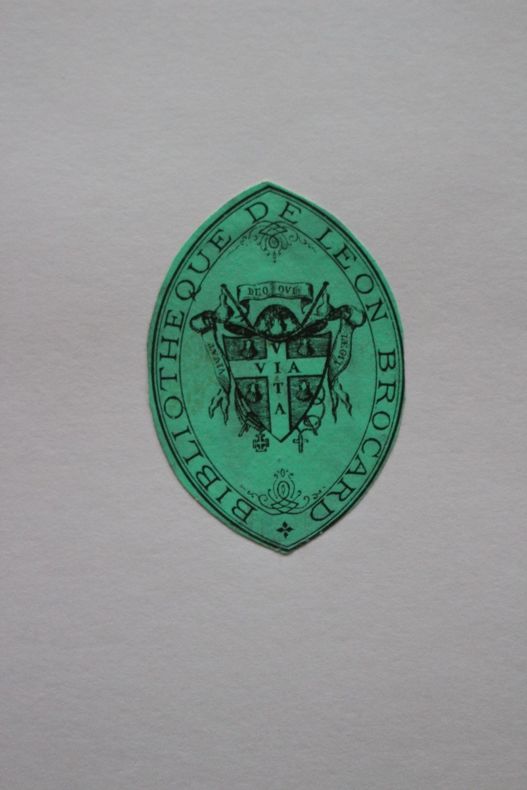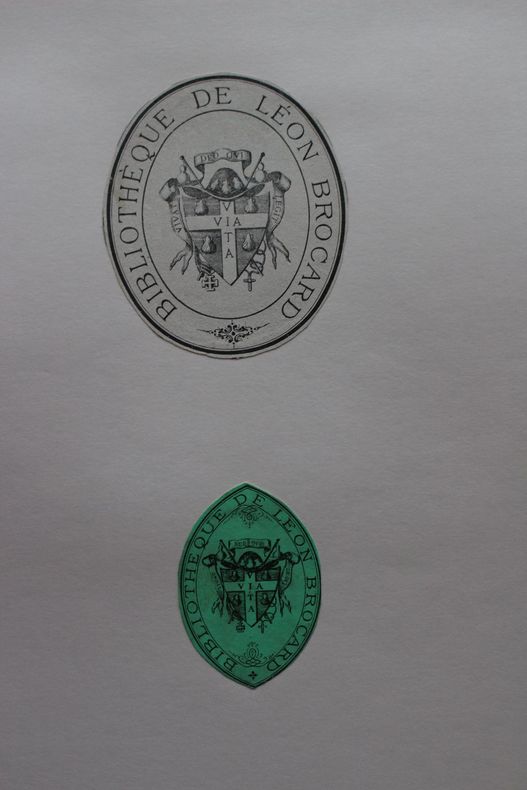 Ex-libris collé(s) sur une feuille cartonnée 21*27cm. Lot de 2 Ex-libris très proches, armoriés (72*61mm & 51*35mm) avec la devise « Vivat Deo qui legit ».