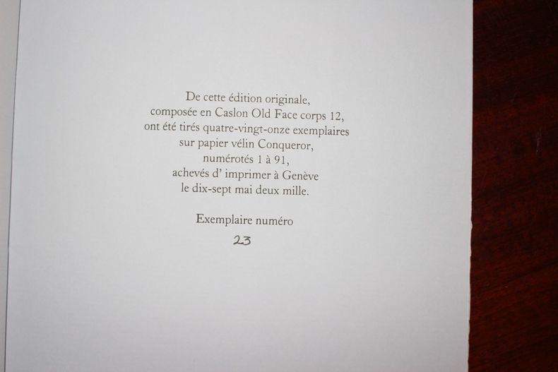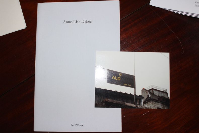 Genève, Iles Célèbes, 2000. In-8, [20]p. Edition originale tirée à 91 exemplaires, sur papier vélin Conquéror (bleu), ici le n°23. Cet ouvrage contient trois poèmes dont un dédié à Alain-Pierre Pillet (1947-2009) (n°0014). Broché, très bel exemplaire. On joint une photo prise par Pillet en avril 2000, signée au dos APP. Cette photo représente un panneau en partie effacé sur lequel le nom quasi-effacé laisse apparaître trois lettres : ALD, les initiales de Anne-Lise Dehée.