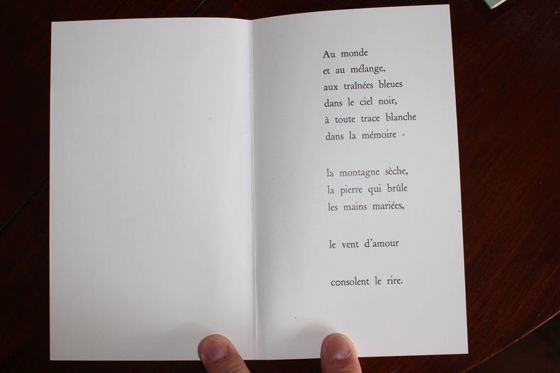 S.l., s.n., s.d. [ca.1982 ?], 4p in-8. Court poème d'une page écrit sur un double feuillet. La première page ne comporte que l'auteur et le titre. Ce poème semble avoir été publié en tête de Poèmes du mélange en 1982