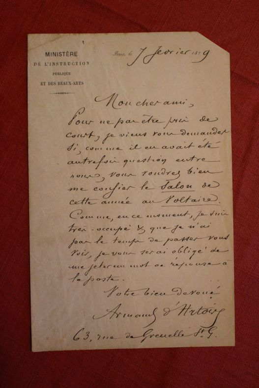 Armand d'Artois (1847-1912), écrivain, critique, L.A.S., Paris, 7 février 1879, 1p in-8 (16 lignes). En-tête du Ministère de l'Instruction Publique. Il demande à Scholl de lui confier le Salon (de peinture probablement) au Voltaire, journal encore tout jeune, créé en 1878 pour soutenir Léon Gambetta. Il ne peut passer le voir étant très occupé et lui demande une réponse. [109]
