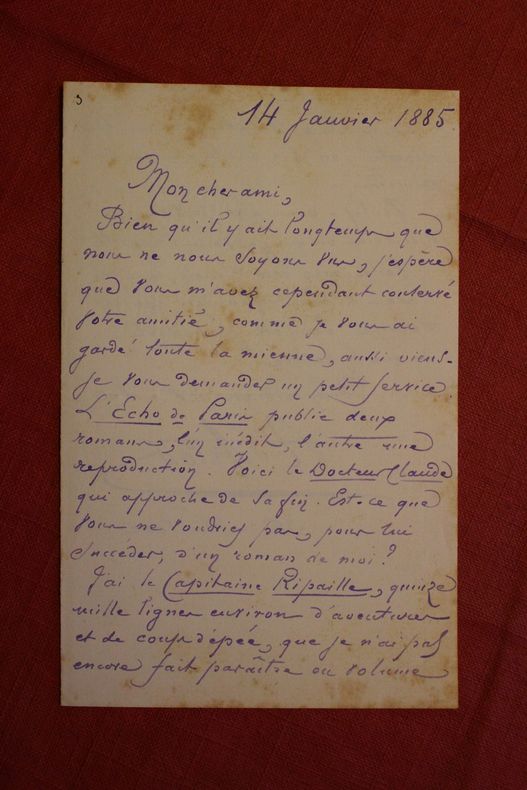Armand d'Artois (1847-1912), écrivain, critique, L.A.S., 14 janvier 1885, 2p in-8 (27 lignes). Belle lettre demandant à Scholl s'il accepterait de publier un de ses romans en feuilleton dans L'Echo de Paris. En effet, la publication du Docteur Claude d'Hector Malot (publié à l'origine en 1879) approche de sa fin et il propose son Capitaine Ripaille, « quinze mille ligne environ d'aventures et de coups d'épée » qui n'a pas encore été publié en volume et a eu beaucoup de succès dans la Liberté. Ce roman, l'un des deux de capes et d'épée d'Artois, sera publié en volume en 1892. Beau document. [109]