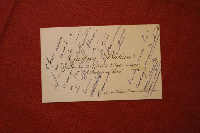 Charles Chincholle (1843-1902), journaliste, écrivain, grand ami de Scholl, C.A.S., 6 juin 1896, 2p in-16 (10 lignes). Carte de visite dépliante, écrite à l'intérieur (parties séparées) : « Quelle joie pour moi quand tout à l'heure je serai à la table hospitalière de Mr le conseiller d'Etampes ! Et quel orgueil, que je ne croyais plus, à cause de tes nouvelles fonctions. C. Chin Scholl ». [115]