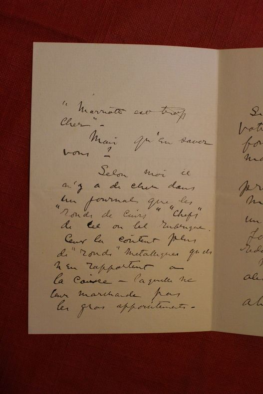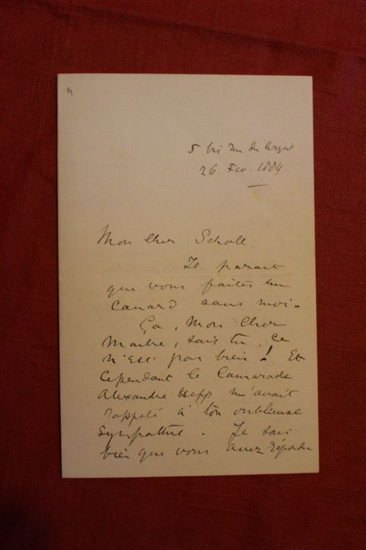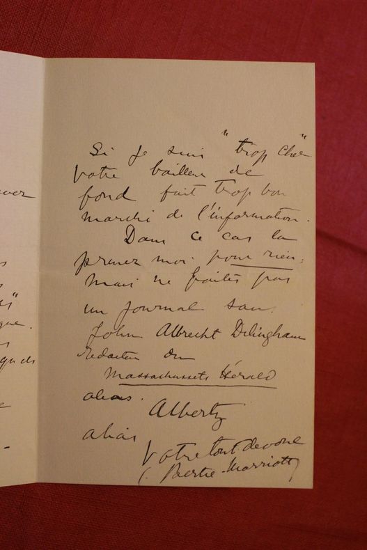 Clément Bertie-Marriott (1848-ap.1904), journaliste, écrivain, L.A.S., 26 février 1884, 3p in-12 (40 lignes). Amusante lettre : « Il parait que vous faites un canard sans moi. Ca, mon cher maître, sais-tu que ce n'est pas bien ! Et pourtant le camarade Alexandre Hepp m'avait rappelé à ton oublieuse sympathie. Je sais très bien que vous avez répondu « Marriott est trop cher ». Mais qu'en savez-vous ». Il argumente donc pour que Scholl ne fasse pas un journal « sans John Albrecht Dilingham rédacteur du Massachussets Hérald alias Alberty alias votre tout dévoué Bertie-Marriott ». Joli courrier. [113]