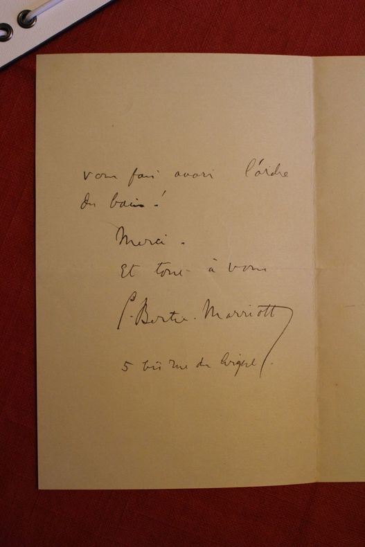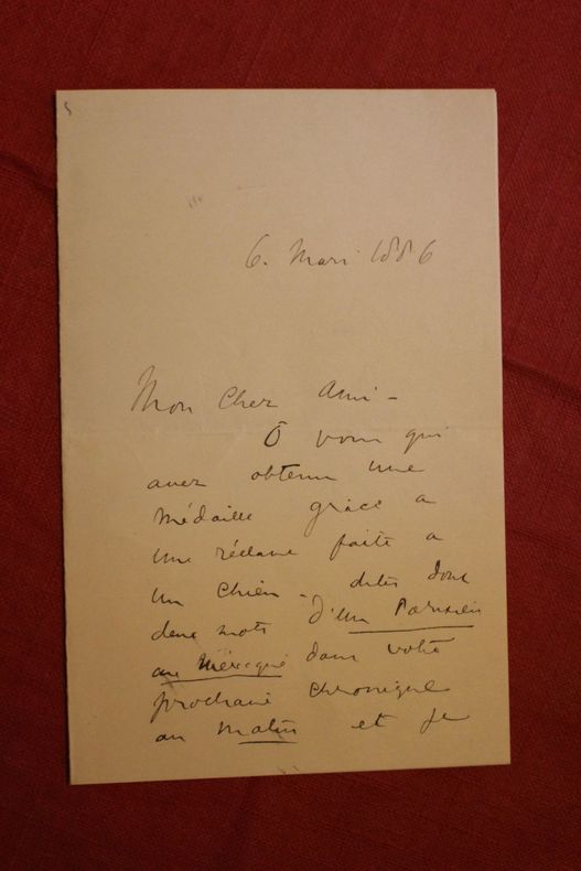 Clément Bertie-Marriott (1848-ap.1904), journaliste, écrivain, L.A.S., 6 mars 1886, 2p in-8 (14 lignes). Amusante demande : « Ô vous qui avez obtenu une médaille grâce à une réclame faite à un chien, dites donc deux mots d'un Parisien au Mexique dans votre prochaine chronique au Matin et je vous fais avoir l'ordre du bain ! ». L'ordre du bain est un ordre anglais. [113]