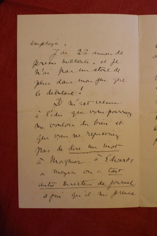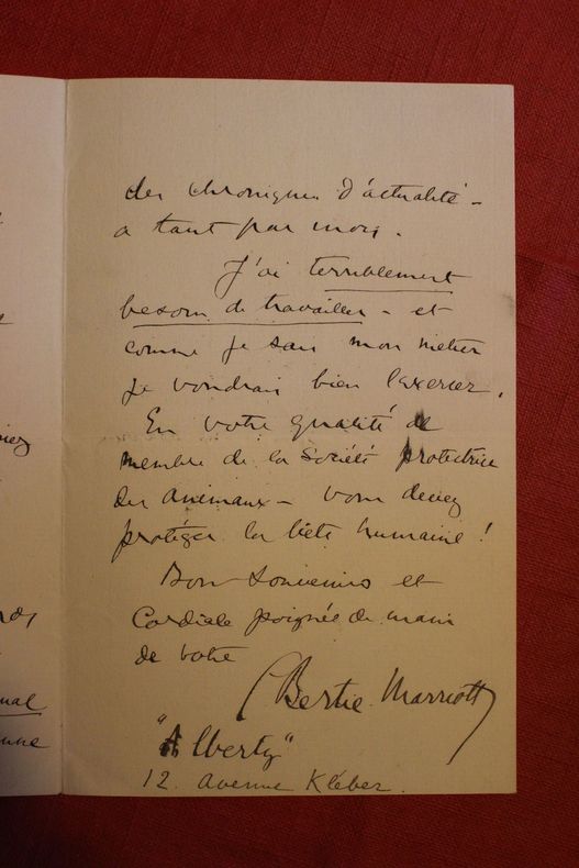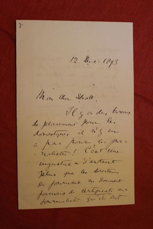 Clément Bertie-Marriott (1848-ap.1904), journaliste, écrivain, L.A.S., 12 décembre 1893, 3p in-8 (39 lignes). Amusant courrier : « Il y a des bureaux de placement pour les domestiques, il n'y en a pas pour les journalistes ! C'est une injustice ». Il demande à Scholl de dire un mot pour lui à Edmond Magnier, Alfred Edwards, Arthur Meyer ou « tout autre directeur de journal ». Il a besoin de travailler. « En votre qualité de membre de la société protectrice des animaux, vous devez protéger la bête humaine ». [113]