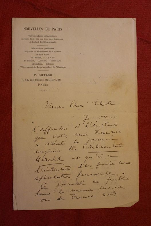 Clément Bertie-Marriott (1848-ap.1904), journaliste, écrivain, L.A.S., sd, 3p in-8 (36 lignes). En-tête des Nouvelles de Paris. Ayant appris que Laurier, ami de Scholl, a acheté le journal anglais The Continental Herald, journal auquel il a toujours refusé de travailler du temps de M. Dalz, l'ancien rédacteur en chef, il demande à Scholl de le recommander auprès de Laurier dans « la nouvelle combinaison ». [113]