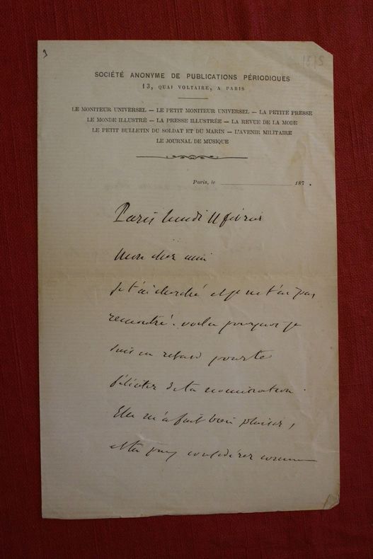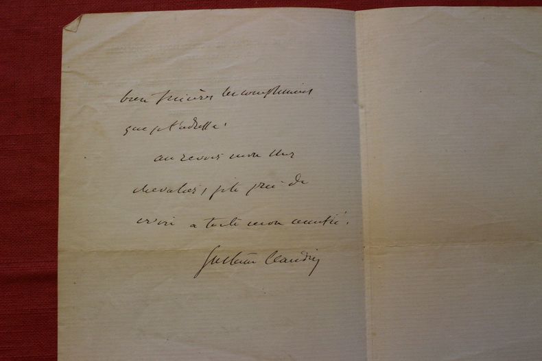 Gustave Claudin (1819-1896), écrivain, journaliste, secrétaire de Lamartine, L.A.S., Paris, lundi 11 février [1878], 1pœ in-8 (13 lignes). Il félicite Scholl pour sa nomination. Il a en effet été fait chevalier de la Légion d'Honneur le 8 février 1878. Il écrit d'ailleurs à la fin : « au revoir mon cher chevalier ». [116]