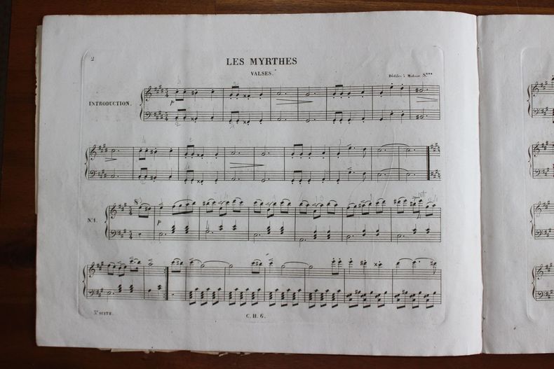 Jean Michaëli, Partition gravée pour piano - Les Myrthes, valses. Paris, Heu, ca.1840. In-folio oblong, 11p. Sous couverture imprimée jaune, abîmée. [II-2]