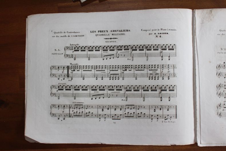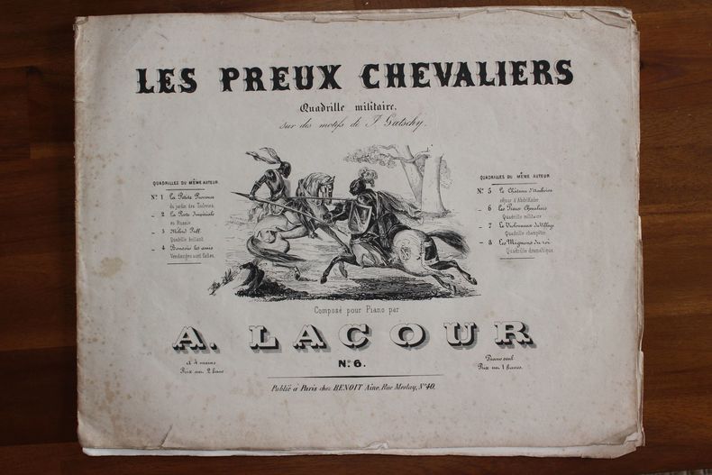 A Lacour, Partition gravée pour piano - Les preux chevaliers, quadrille militaire.i Paris, Benoit, ca.1840. In-folio oblong, titre-13p [II-4]