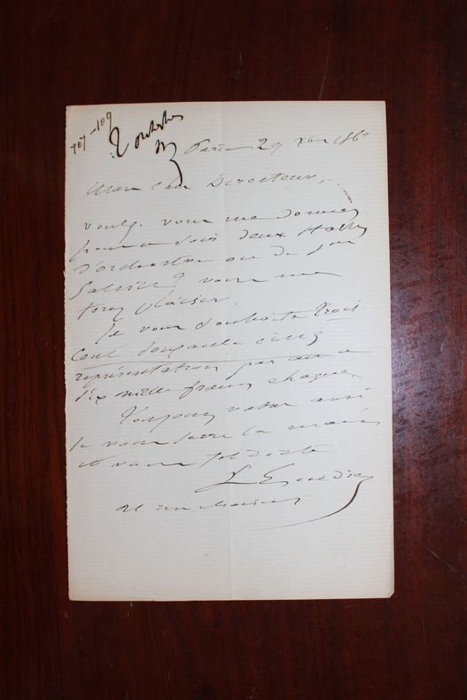 Léon Escudier (1821-1881), journaliste, critique. L.A.S., 29 décembre 1862, 1p in-8. Il demande deux places à un directeur de théâtre. [189]