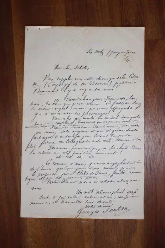 Georges Sauton (1842-1888), journaliste, romancier. L.A.S., sd, 1p in-8. Il propose à Scholl un roman à publier en chronique dans l'Echo de Paris en développant un peu autour des personnages de celui-ci. [213]