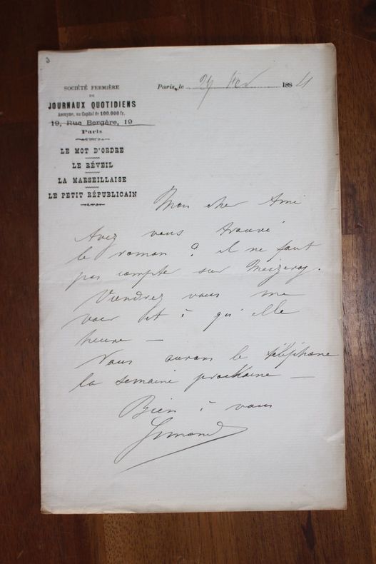 Valentin Simond (1842-1900), journaliste, patron de presse. L.A.S., 24 février 1884, 1p in-8. En-tête de la société fermière de journaux quotidiens. A Scholl. Il lui demande s'il a avancé son roman (probablement pour un feuilleton) car il ne peut pas compter sur René Maizeroy. Il lui demande de venir et signale qu'il aura le téléphone la semaine suivante. [214]