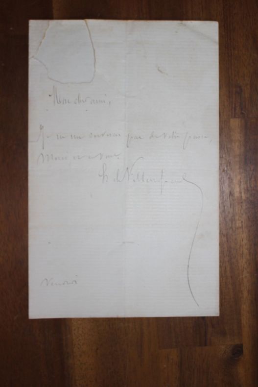 Hippolyte de Villemessant (1810-1879), journaliste, patron de presse. L.A.S., sd, 1p in-8. A Scholl : « Je ne me servirai pas de votre passe, merci, et à vous ». [217]