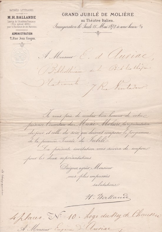 Hilarion Ballande (1820-1887), auteur, acteur, directeur de théâtre. L.S. (signature imprimée), sd [1873], 1p in-4. Lettre circulaire pour le Grand Jubilé de Molière au théâtre italien le 15 mai 1873. Les blancs étaient alors remplis pour indiquer le destinataire et le nombre de places. Ici, il s'agit d'Eugène d'Auriac, bibliothécaire de la bibliothèque nationale qui avait le droit à 4 places. Cette inauguration du Musée Molière fut un échec retentissant et Ballande y perdit 20.000 francs. Ancienne collection JL Debauve, provient de la vente des papier d'Auriac en décembre 1978. [232]