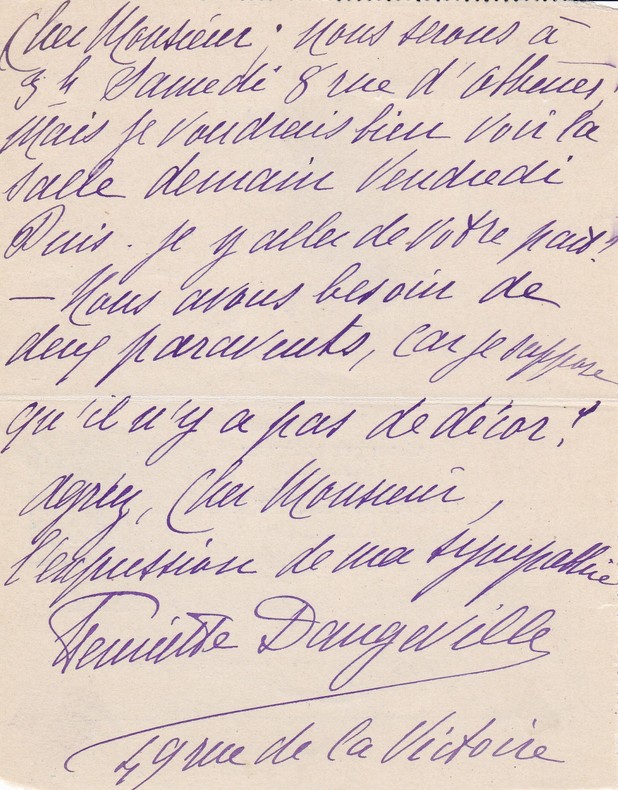 Henriette Dangeville (fin XIXe-début XXe), actrice (à ne pas confondre avec l'alpiniste). L.A.S., 22 juin 1899, 1p in-12. Au chansonnier Gabriel Montoya. Elle demande à voir la salle où elle doit jouer. Anciennes collections Henri Bachimont, JL Debauve. [233]