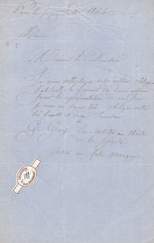 G Gay, artiste dramatique. L.A.S., 7 juillet 1864, 1p in-8. Il demande au directeur du théâtre des variétés deux entrées pour le soir. Anciennes collections Henri Bachimont, JL Debauve. [235]