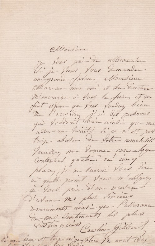 Caroline Dornal dit Gilbert (née vers 1814), actrice active de 1851 à 1886. L.A.S., 12 août 1865, 1p in-8. Elle demande au directeur des Variétés de la part de Moreau son directeur une loge de 4 à 5 places ou telle autre place « que vous voudrez ». Anciennes collections Duchêne de la Sicotière, JL Debauve. [237]