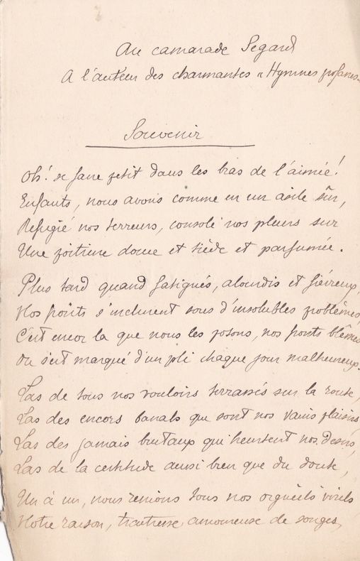 Pierre Le Boucq de Ternas (1866-1948), juriste, inspecteur des finances. Poème A.S., 25 juillet 1894, 1pœ in-8. A Achille Ségard (1872-1936), écrivain, Journaliste. Poème titré Souvenirs et dédicacé à Ségard, 20 vers (5 quatrains). Amusant document de cet inspecteur des finances qui a probablement eu des velléités de carrière littéraire. [254]