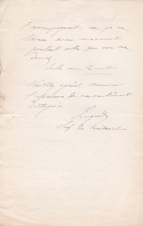 Julia Pingard (1829-1905), chef du secrétariat de l'Institut de France. L.A.S., Paris, 23 mai 1901, 2p in-8. A Achille Ségard (1872-1936), écrivain, journaliste. Sur les conditions pour que Ségard puisse récupérer son manuscrit. Il avait probablement participé à un concours. [255]