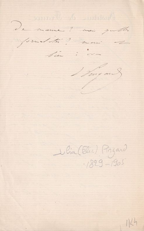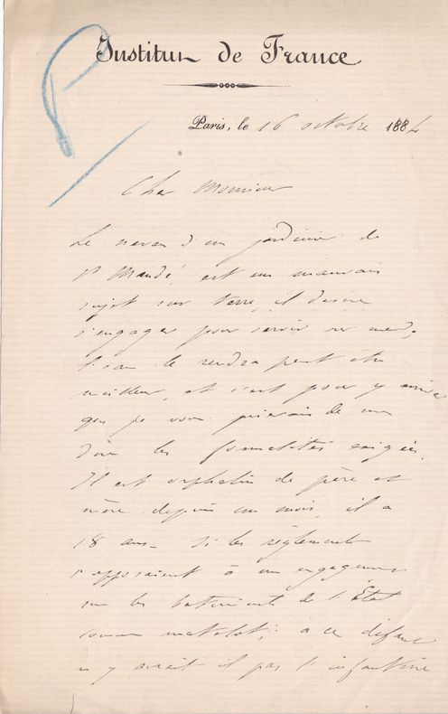 Julia Pingard (1829-1905), chef du secrétariat de l'Institut de France. L.A.S., 16 octobre 1884, 1pœ in-8. A Edouard Guinand. Elle recommande à son correspondant M. Mandé, qui est un mauvais jardinier et souhaite s'engager dans la marine. Il y sera probablement un meilleur homme. [179b]