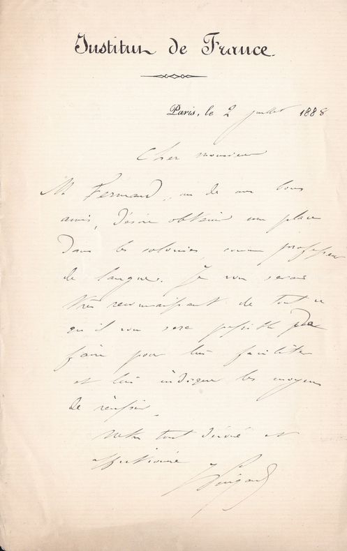 Julia Pingard (1829-1905), chef du secrétariat de l'Institut de France. L.A.S., 2 juillet 1888, 1p in-8. A Edouard Guinand. Elle lui recommande M. Fernand qui souhaite obtenir une place de professeur dans les colonies. [179b]
