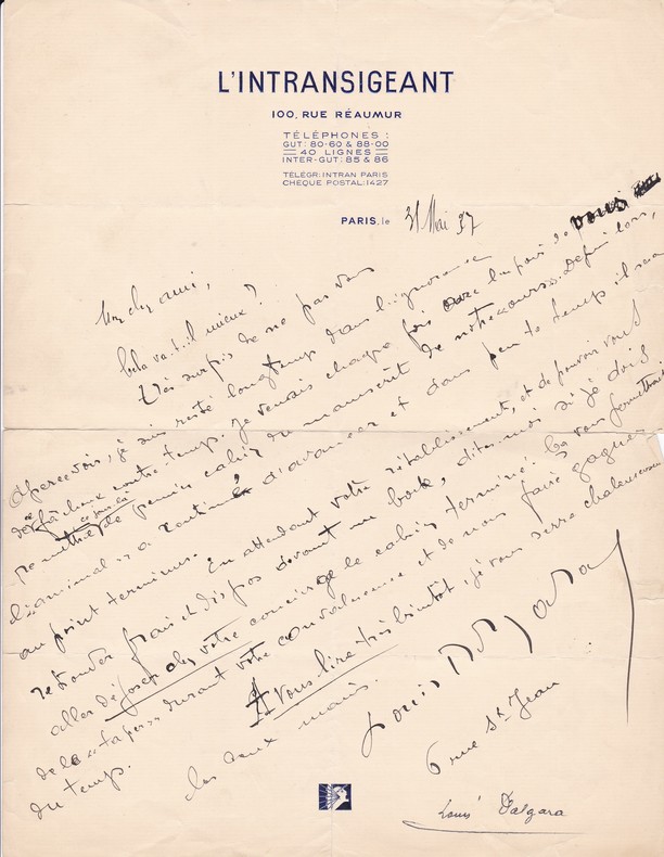 Louis Dalgara (1885-1978), poète, comédien ambulant, libertaire. L.A.S., 31 mai 1937, 1p in-4. En-tête de l'Intransigeant. Probablement à Jean Desbousquet. Jolie lettre amicale demande des nouvelles de son ami malade. [181b]