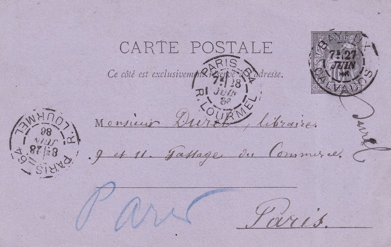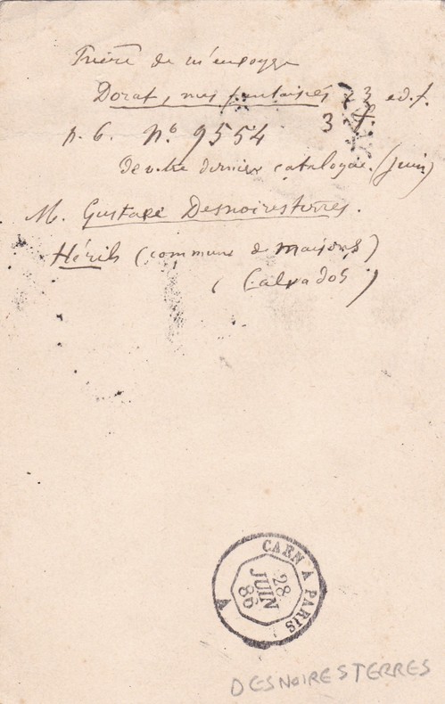 Gustave Desnoiresterres (1817-1892), bibliophile, écrivain, journaliste. L.A.S., 27 juin 1880, 1p in-12. Carte postale à Durel pour lui commander un ouvrage de Dorat sur son dernier catalogue. [260]