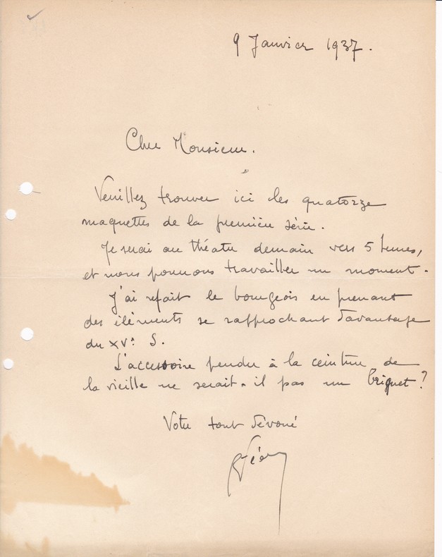 Robert Féau (XXe), illustrateur, costumier. L.A.S., 9 janvier 1937, 1p in-4. A Gaston Baty (1885-1952), homme de théâtre, cofondateur du Cartel des quatre. Il envoie des maquettes [de costumes] et sera au théâtre le lendemain pour en parler. Il parle de détails pour le costume du bourgeois et celui de la vieille. Robert Féau travailla à de nombreuses reprises pour les mises en scène de Gaston Baty. Bizarrement, pour Les Ratés de Lenormand, on n'a retenu que le nom d'Olga Choumansky alors que cette lettre prouve qu'il a participé aux costumes. [327]