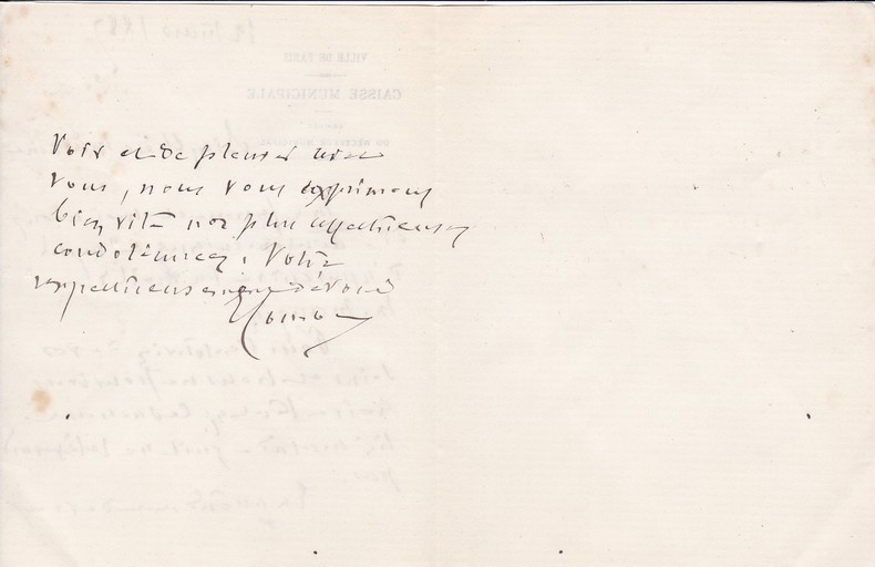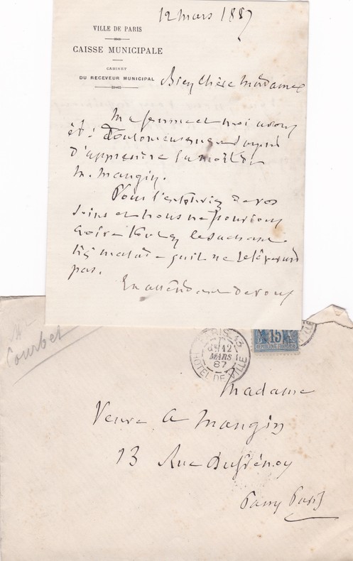 Eugène Courbet (XIXe), bibliophile, homme de lettres, receveur municipal. L.A.S. + enveloppe, 12 mars 1887, 1pœ in-12. A Mme Arthur Mangin. Lettre de condoléances envoyée le jour-même de la mort d'Arthur Mangin. [299-3]