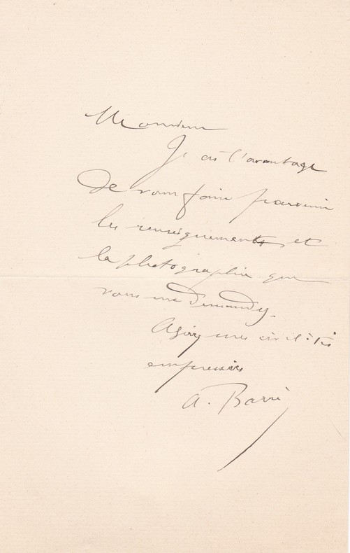 Albert Barré (1854-1910), auteur dramatique. L.A.S., sd, 1p in-8. Il envoie un renseignement et une photographie demandée par son correspondant. [325]