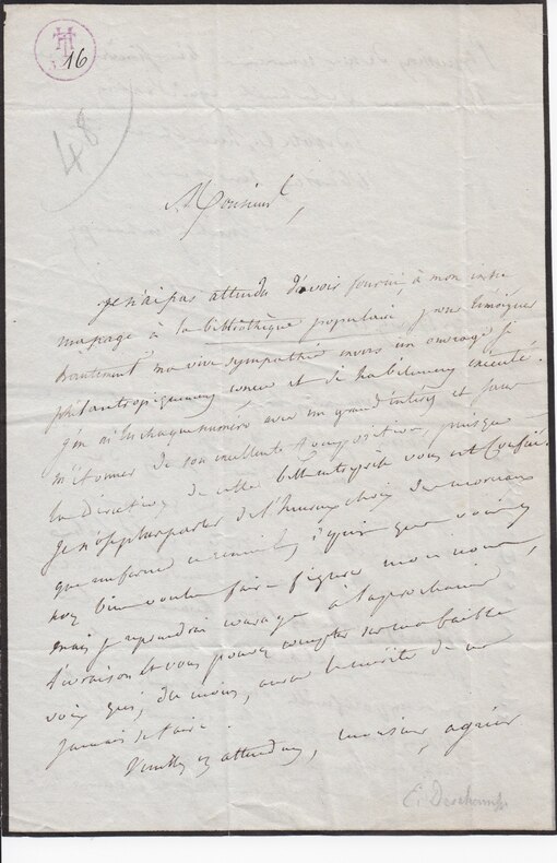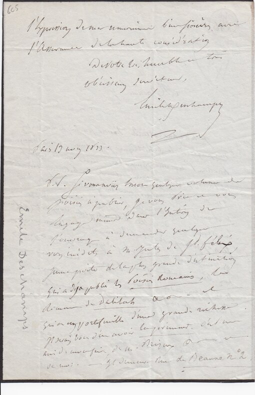 L.A.S., Paris, 13 novembre[?] 1833, 2p in-8. A Stéphane Ajasson de Grandsagne (1802-1845), directeur de la Bibliothèque populaire. « Monsieur, Je n'ai pas attendu d'avoir fourni à mon insu ma page à la bibliothèque populaire pour témoigner hautement ma vive sympathie envers un ouvrage si philanthropiquement conçu et si habilement exécuté. J'en ai lu chaque numéro avec un grand intérêt et sans m'étonner de son excellente composition, puisque la direction de cette bibliothèque vous est confiée. Je n'ose plus parler de l'heureux choix des morceaux que renferme ce recueil, puisque vous avez bien voulu faire figurer mon nom mais je reprendrai courage à la prochaine livraison et vous pouvez compter sur ma faible voix qui, du moins, aura le mérite de ne jamais se taire. Veuillez en attendant, monsieur, agréer l'expression de mes remerciements bien sincères avec l'assurance de la haute considération de votre très humble et très obéissant serviteur Emile Deschamps. P.S. Si vous aviez encore quelque volume de poésies à publier, je vous prie et vous engage même dans l'intérêt de l'ouvrage à demander quelques vers inédit à m. Jules de St Félix, jeune poète de la plus grande distinction qui a déjà publié les Poésies Romaines, le roman de Dalilah etc. et qui a un portefeuille d'une grande richesse. Il serait bon d'en avoir la primeur. C'est un ami de mon frère, de M. Brizeux et de moi. Il demeure rue de Beaune n°2 ». La fin de cette lettre, concernant donc Jules de Saint-Félix, a été publiée par Jules Marsan dans son ouvrage La bataille romantique (Paris, Hachette, 1912, note de la p.251). Très belle lettre. [178b]