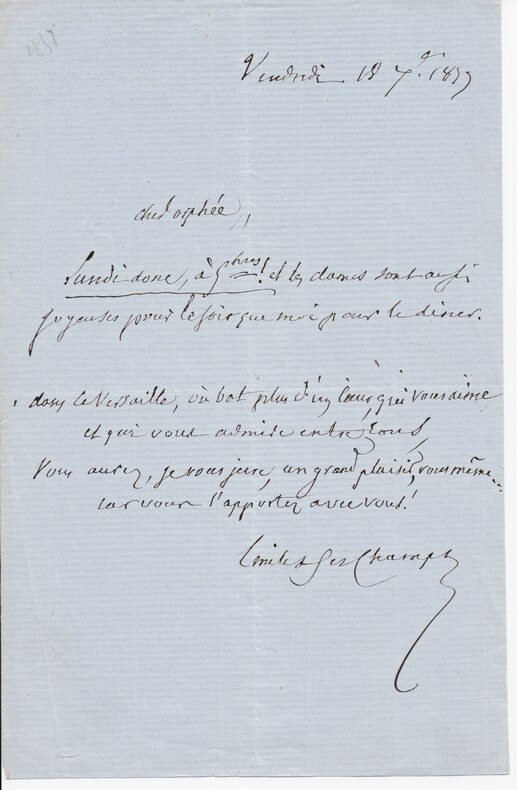 L.A.S. avec quelques vers, Vendredi 18 septembre 1859, 1p in-8. A un ami proche, nommé Orphée. « Cher Orphée, Lundi donc, à 5hres ! et les dames sont aussi joyeuses pour le soir que moi pour le diner. Dans le Versaille, où bat plus d'un cour qui vous aime Et qui vous admire entre tous, Vous aurez, je vous jure, un grand plaisir, vous-même. Car vous l'apportez avec vous! Emile Deschamps ». Jolie petite lettre. [188-2]
