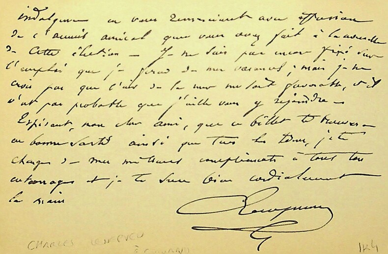 Charles Lenepveu (1840-1910), compositeur et pédagogue, prix de Rome 1866. L.A.S., Paris, 26 juillet [1896], 2p in-12. Au poète Edouard Guinand (1838-1909). Remerciements pour les félicitations suite à son élection à l'Institut. Il explique les raisons de son retard (il a été élu le 2 mai 1896), donnant la liste de ses nombreuses activités : tournée d'inspection, obligations des concours, des commissions, des travaux professionnels. Belle lettre amicale à celui qui écrivit le livret d'Iphigénie (1887). [250]