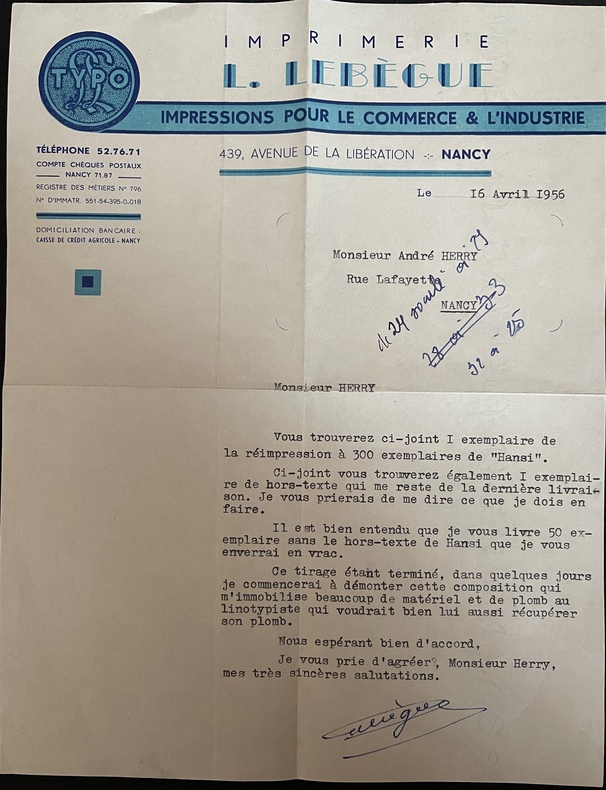 L Lebègue, imprimeur à Nancy. L.A.S., Nancy, 16 avril 1956, 1p in-4. Au graveur André Herry (1899-1967). Lettre concernant des retirages d'Hansi dont des hors-texte. [242]