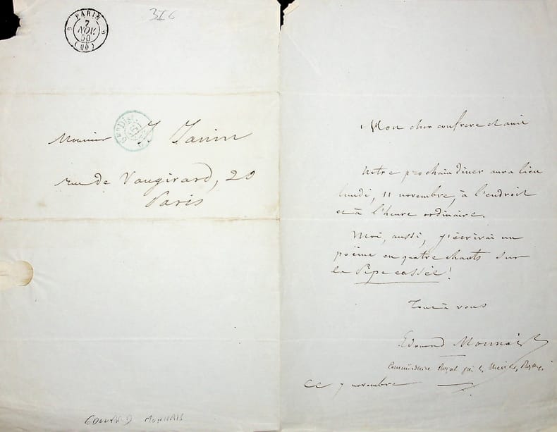 Edouard Monnais (1798-1868), écrivain, administrateur, journaliste. L.A.S., 7 novembre 1850, 1p in-8. A l'écrivain Jules Janin (1804-1874). Il indique à Janin la date d'un dîner, vraisemblablement pour la société du caveau. Ce dîner avait pour thème la Pipe cassée et Monnais prévoit d'écrire un poème en quatre chants. [306-2]