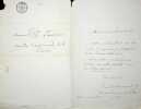 Félix Le Couppey (1811-1887), compositeur, pianiste. L.A.S., sd [1865], 1p in-12. A l'écrivain Jules Janin (1804-1874), qui a noté « rép. 2 août 1865 ». « Mon cher ami, Je n'ai pas oublié la jeune fille dont vous m'avez parlé. Veuillez lui faire savoir que je l'attendrai jeudi matin à 10h 1/2. Mille amitiés. F Le Couppey ». Cette lettre est conservée dans une pochette de la collection Jules Janin. [396]