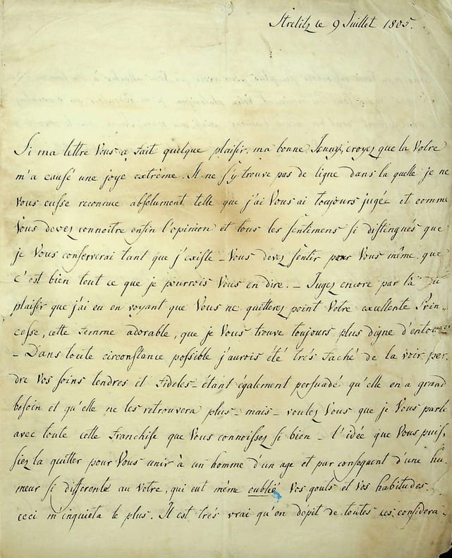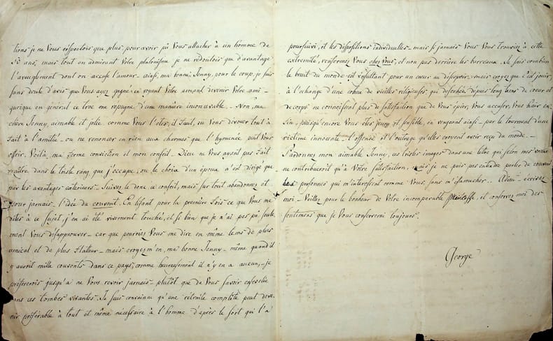 Georges de Mecklembourg-Strelitz (1779-1860), prince allemand. L.A.S., Strelitz, 9 juillet 1805, 3p in-4. Longue et belle lettre en français à une amie, Jenny, qui va épouser un « homme de 50 ans, mais tout en admirant votre platonisme, je ne redoutais que d'avantage l'aveuglement dont on accuse l'amour - ainsi, ma bonne Jenny, pour le coup je suis sans doute d'avis que vous avez gagné en votre amant devenir votre ami, quoique en général ce troc me répugne d'une manière inconcevable ». Cette Jenny était-elle un amour de jeunesse du prince ? Il insiste aussi longuement sur les défauts défauts des couvents pour que sa correspondante n'y aille pas. Petites déchirures en bordure. Très belle lettre. [317]