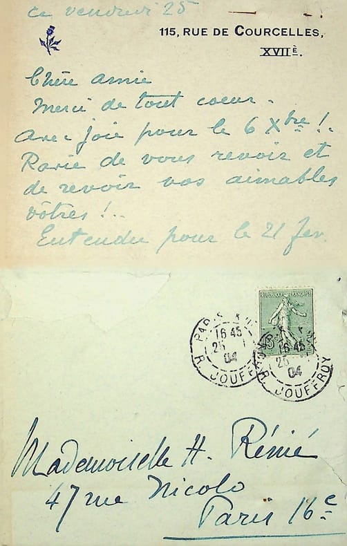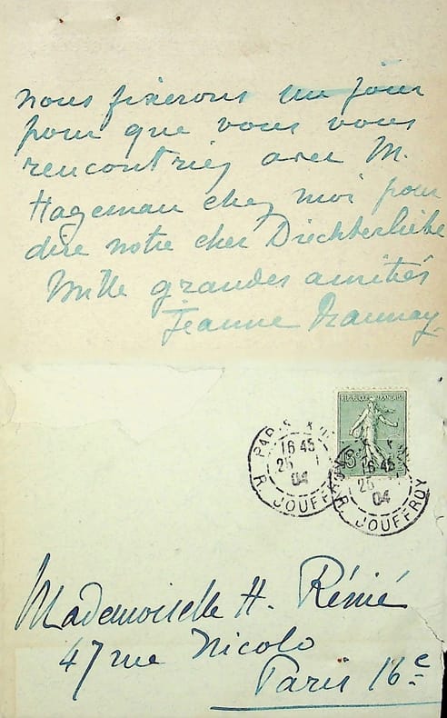 Jeanne Raunay (1863-1942), chanteuse d'opéra, mezzo-soprano. L.A.S. + enveloppe, vendredi 25 janvier 1904, 2p in-12. A la compositrice et harpiste Henriette Renié (1875-1856). Elle la remercie pour « le 6 décembre », confirme un rendez-vous le 21 février et parle de fixer une date pour que Renié rencontre avec Richard Hageman (1881-1966) « pour dire notre cher Dichterliebe » (oeuvre de Robert Schumann). [352-2]